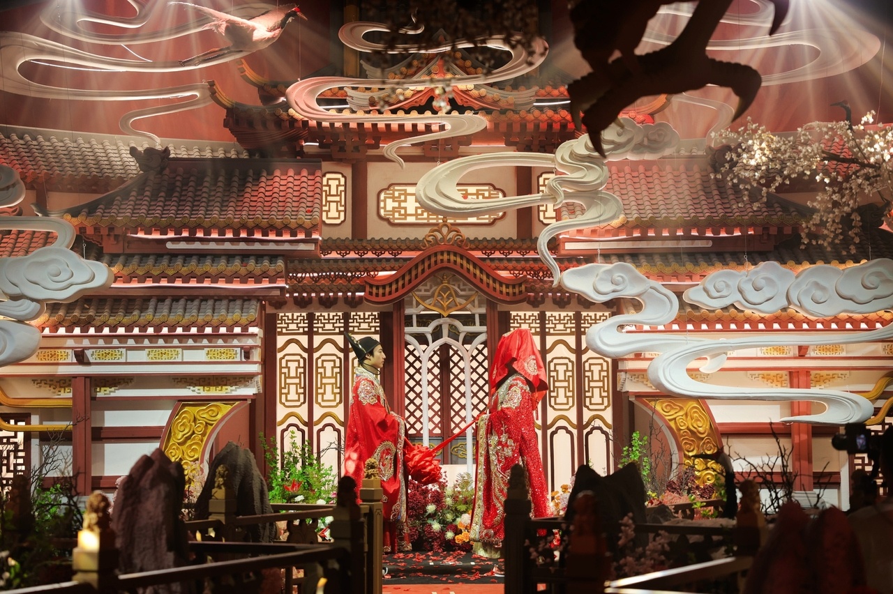如果说婚姻登记与邮轮的邂逅是现代浪漫的创新表达,那么观赋格乐艺术中心及观赋宴的《万邦来朝—梦回盛唐》沉浸式夜宴,则是一场跨越千年的文化对话。踏入宴会现场,仿佛有一道时光之门悄然开启:头顶是璀璨的“星空穹顶”,脚下是复刻唐代纹样的青砖,身着齐胸襦裙的侍女手持宫灯引路,耳畔传来悠悠唐筚篥之声。宾客接过鎏金鹦鹉杯,杯中琥珀色的葡萄酒轻轻摇曳,眼前摆放的是依照《烧尾宴食单》还原的“素蒸音声部”“乳酿鱼”等宫廷美馔,每一道菜都配有一张诗词小笺,如“桃花流水鳜鱼肥”对应一道清蒸鳜鱼,让味蕾在品尝中邂逅唐诗意境。