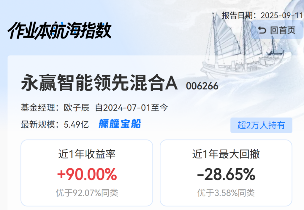 作业本航海指数数据显示,永赢智能领先混合A规模5.49亿,近一年来收益率更加突出,为90%。